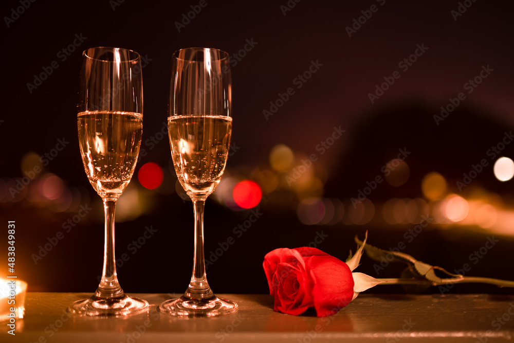Champagne and roses. Valentine's Day, and romantic date night concept.