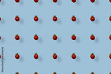 Colorful pattern of fresh red tomatoes on blue background with shadow. Top view. Flat lay. Pop art design