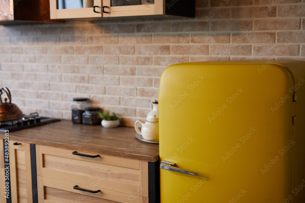 Background image of kitchen interior with brick wall and yellow retro fridge, copy space