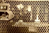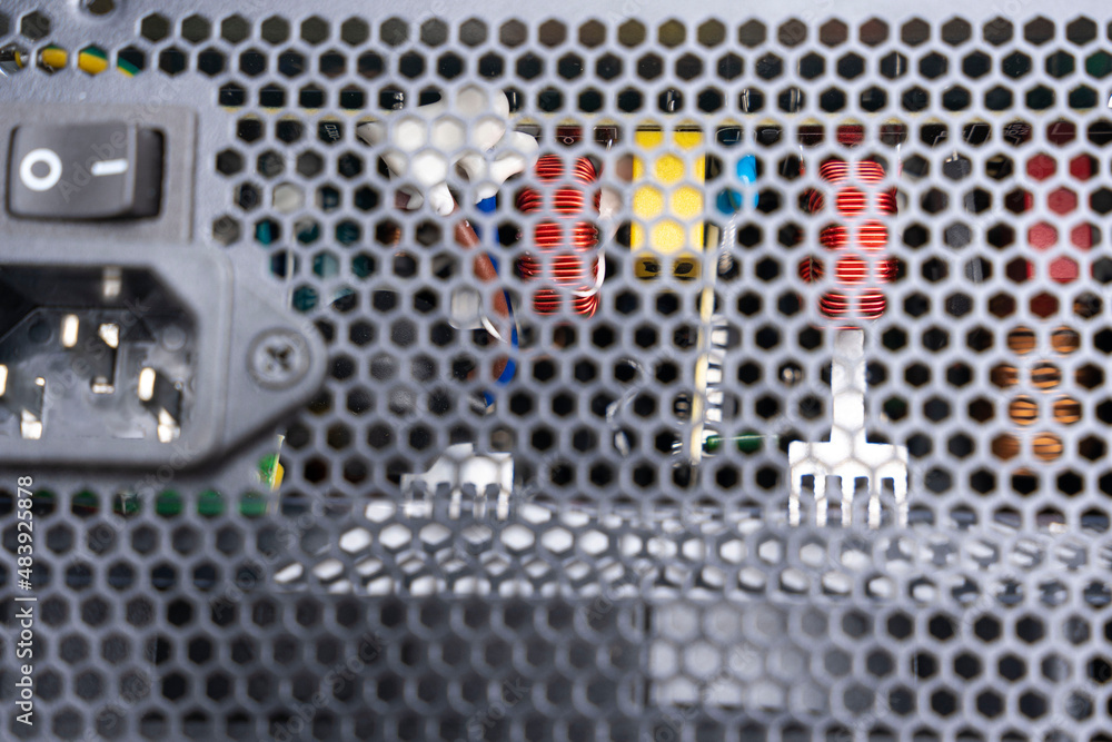 new power supply for a computer with a metal grid through which electronic components are visible