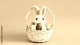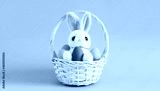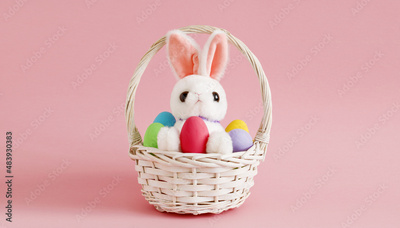 happy easter background cute rabbit toy and decorated eggs in wicker basket on pink background