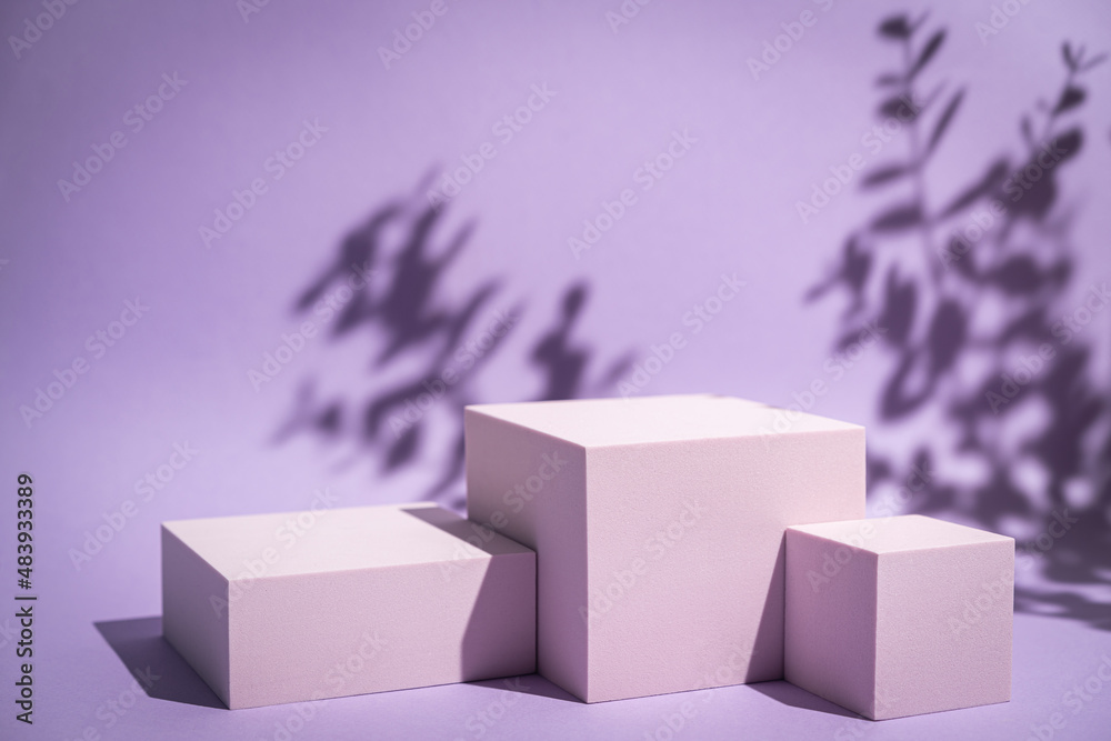 Abstract minimalistic scene with geometric forms. podium on purple background with shadows. product presentation, mock up, show cosmetic product display, Podium, stage pedestal or platform.