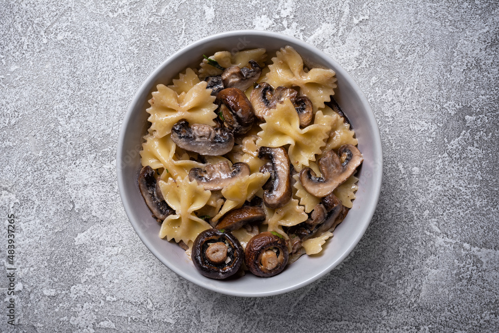 Bowl of italian farfalle pasta and mushrooms with cream sauce