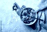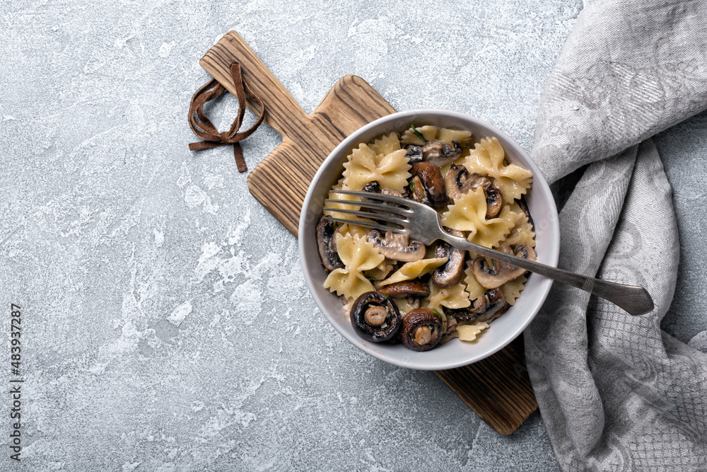 Bowl of italian farfalle pasta and mushrooms with cream sauce