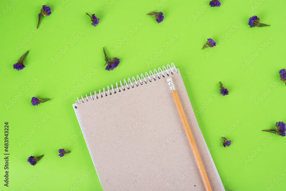 organic paper notebook with pencil on green background with blue flowers. zero waste concept, bussiness concept