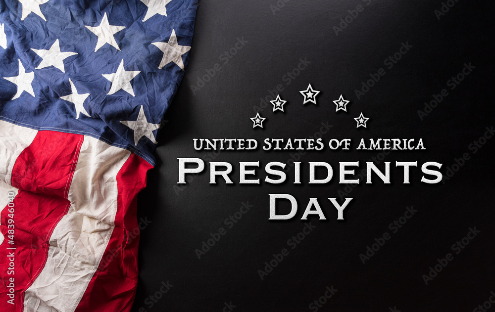 Happy presidents day concept with flag of the United States and the text on dark background.