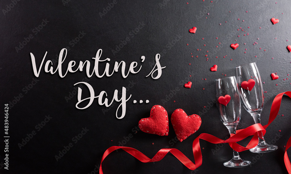 Valentine's day and love concept made from champagne glasses and red hearts on black wooden background. Top view with the text.