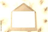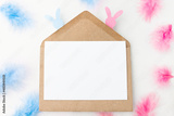 Envelope with a sheet of paper with copy space on a white table, top view. Gender party, with blue and pink decor elements, for the day of determining the sex of the baby. Mockup, flat lay.
