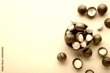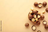 Peeled macadamia nuts in wooden bowl on beige background.