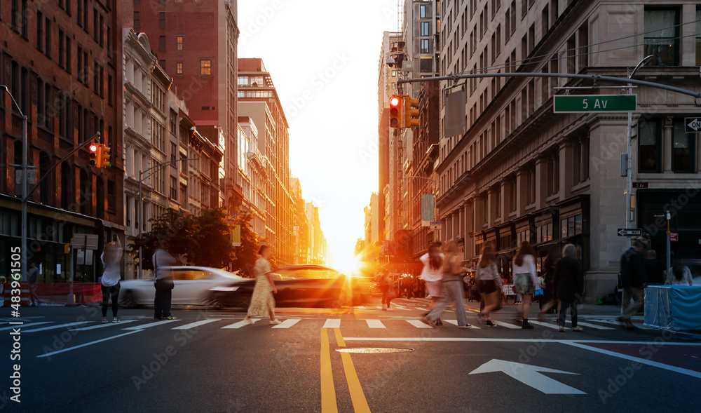 Sunlight shining on the people and cars at a busy intersection on 5th Avenue in Manhattan, New York City