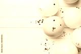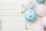 Background with fastive air balloons of round shape and confetti, multicoloured top view. Birthday party background