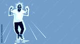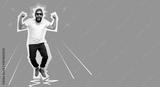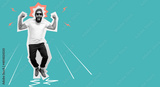 Crazy hipster guy emotions. Jumping, running man. Collage in magazine style. Discount, sale, season sales, copyspace for ad. Colorful summer concept. Facial expression concept.