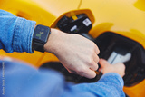 Man Charging Electric Vehicle With Cable Looking At App On Smart Watch
