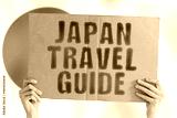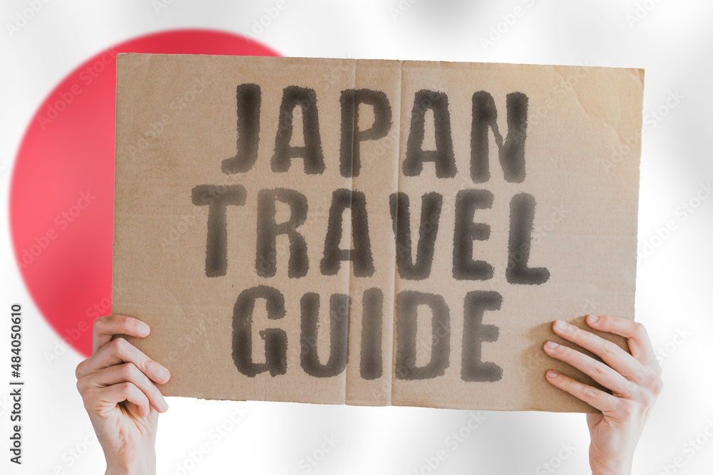 The phrase " Japan travel guide " on a banner in men's hand with blurred Japanese flag on the background. Worldwide. Terminal. Schedule. Relax. Opportunity. Planet. Knowledge. Learn. Flying