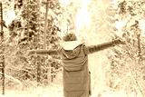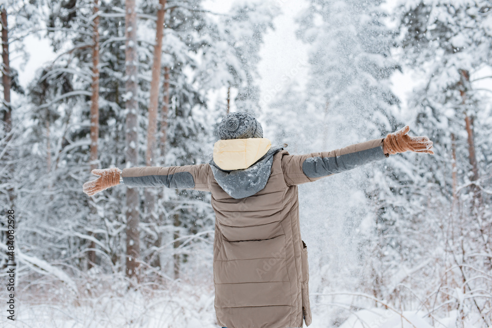 Happy woman walking in winter forest during heavy snowfall, watching falling snowflakes in park
