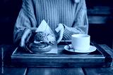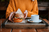 Healthy fast food. Woman holding tasty looking hamburger with vegetables and chicken