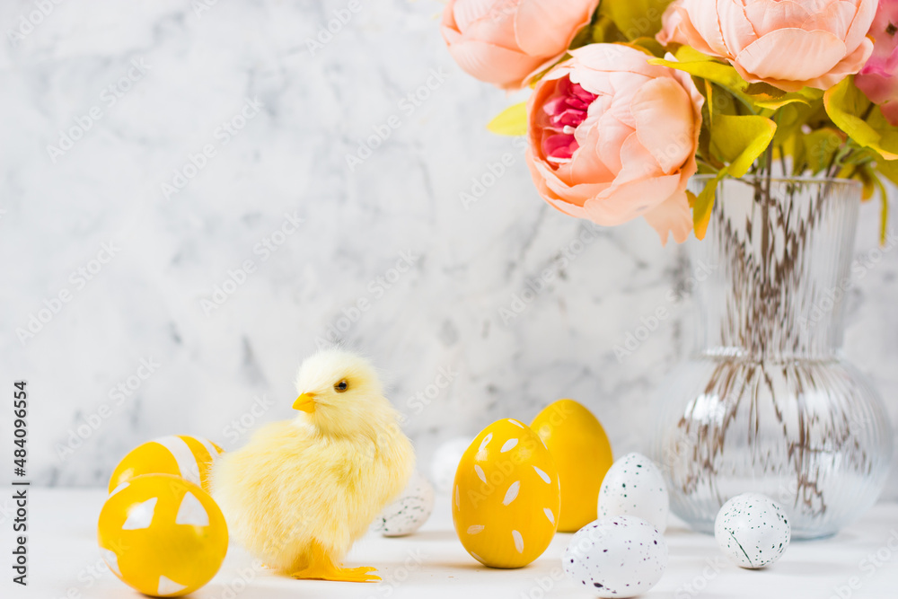 Easter card with colored eggs and chickens on a light background. Happy easter concept.Copy space.