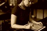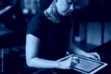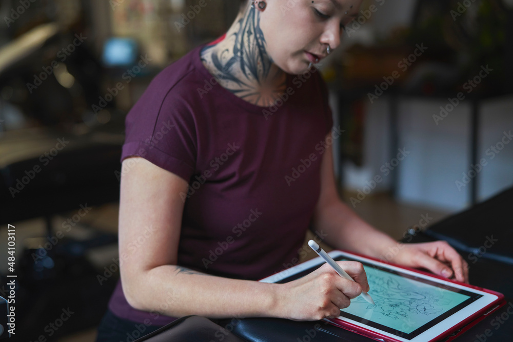 Caucasian tattoo artist designing motifs on digital tablet at tattoo studio
