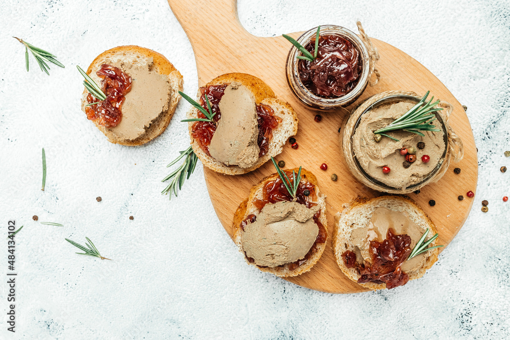 Homemade duck liver pate with red onion jam. Gourmet appetizers, Assorted Italian appetizer bruschetta. banner, menu, recipe place for text, top view