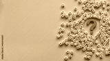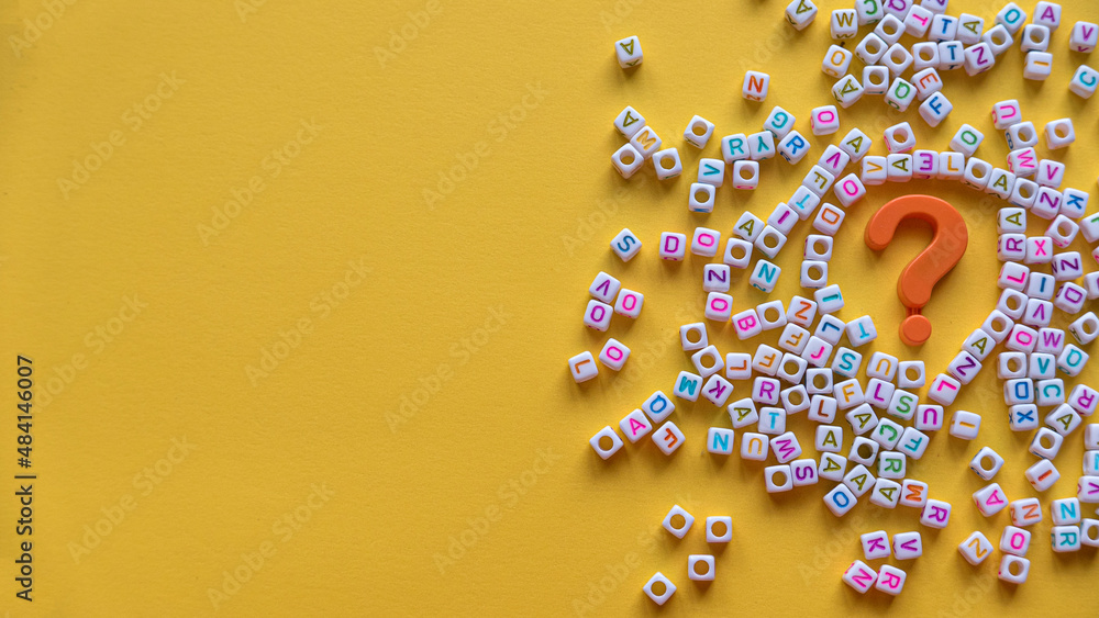 Questions and answers concept. Question symbol and alphabet beads on yellow background with copy space.