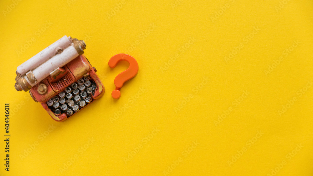 Questions and answers concept. Question symbol and miniature typewriter on yellow background with copy space.