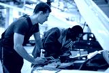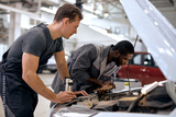 Caucasian and black Men mechanic inspection checking bug in engine from application smartphone. white car for service maintenance insurance with car engine.for transport automobile automotive