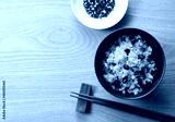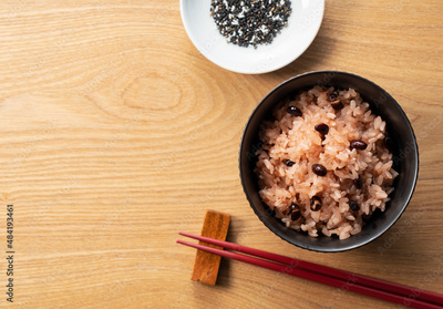 Red rice and sesame salt on a wooden table.