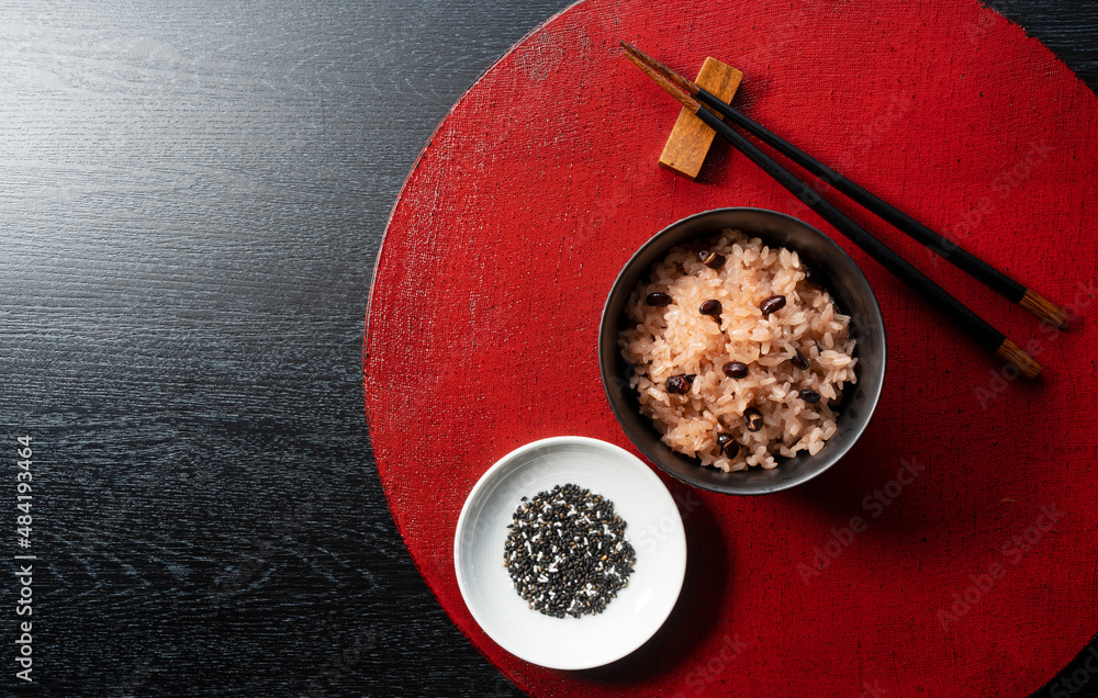 Red rice placed on a red tray.