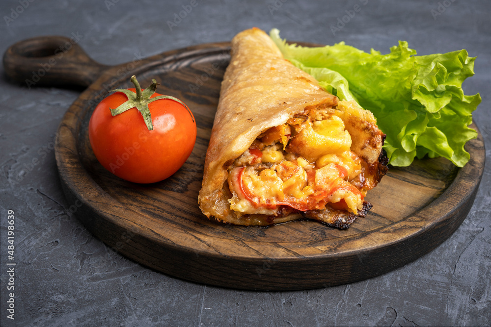 Pizza cone, fresh lettuce leaf and tomato on an oak chopping board.