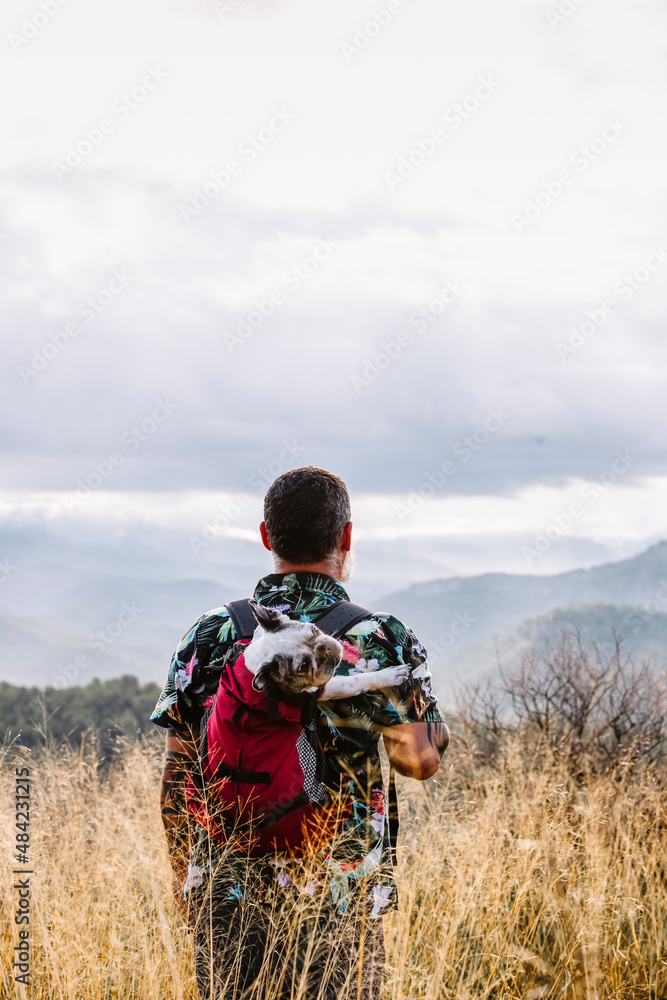 Rear view of traveler with dog in backpack on top of mountain