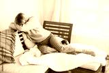 Depressed lonely unhappy mental woman sitting alone on the sofa feel stress