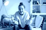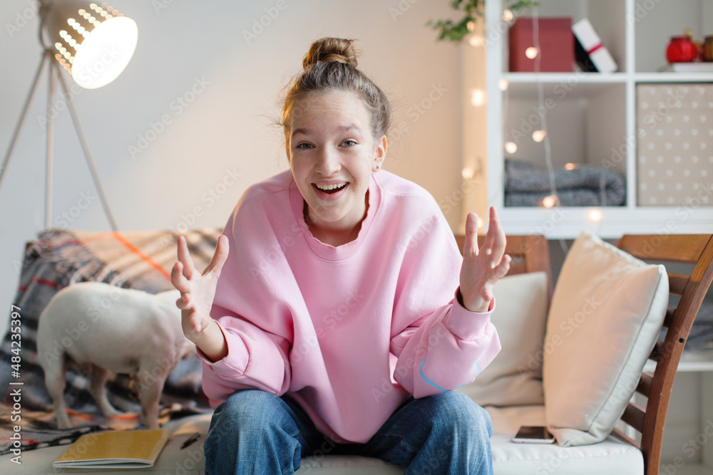 Happy teen girl blogger talking to camera video calling, recording vlog