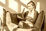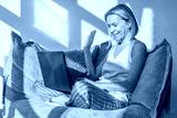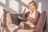 Smiling middle-aged beautiful Caucasian woman sit on couch wave talk on video call on laptop