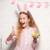 Child is holding a basket with Easter eggs