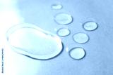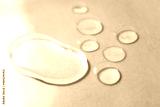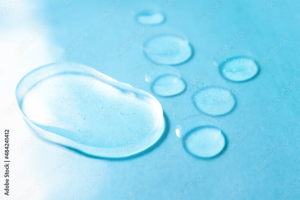 Gel transparent drops of acid on a colored background. Texture of a cosmetic product for body care, moisturizing and cleansing, close-up, top view.