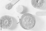 Sugar scrub with orange pieces on a white background, top view. Beauty procedures for peeling and cleansing the skin of the body with a homemade remedy.