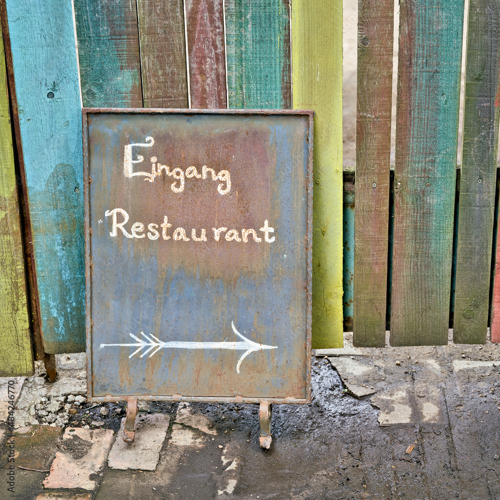 Schild mit der Aufschrift Eingang Restaurant in der Innenstadt von Berlin