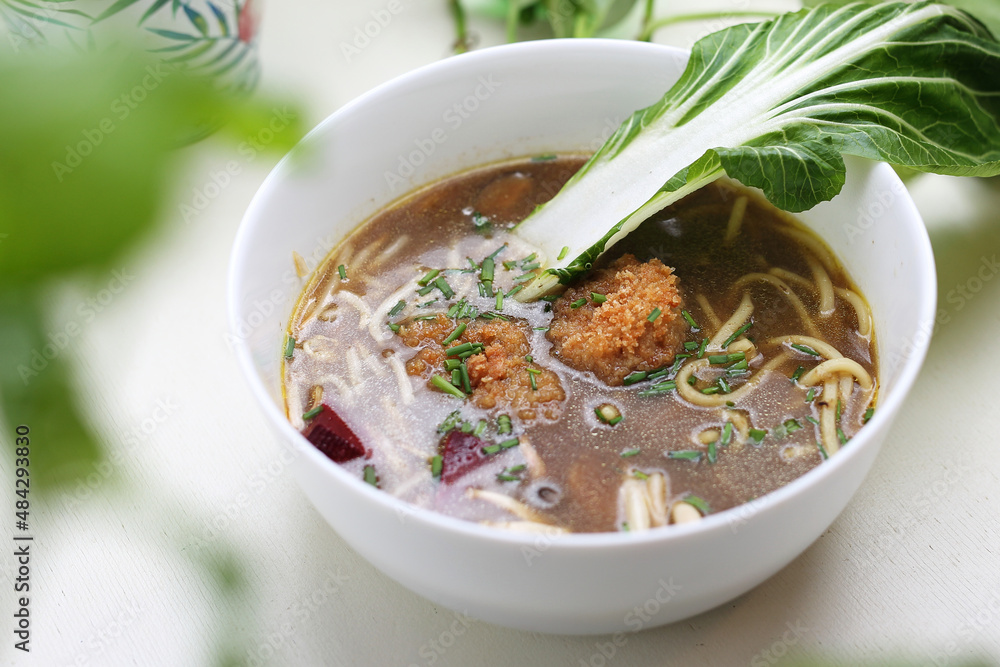 An oriental soup with bok choy, noodles and vegan meatballs in a bowl, on a table, a selective focus.