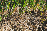 Garlic plants with straw mulch