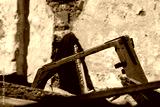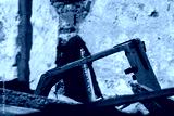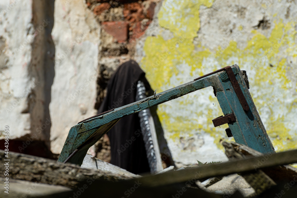 Wnętrze zawalonego budynku, zniszczona rama okienna i ściana.