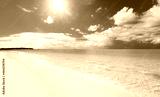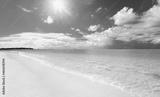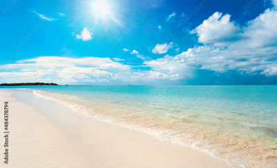 Beautiful background image of tropical beach. Bright summer sun over ocean. Blue sky with light clouds, turquoise ocean with surf and clear white sand. Harmony of clean environment.