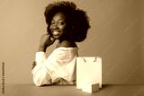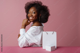 Yong beautiful happy smiling African American woman, model wearing classic shirt, jewelry, posing with small white box, shopping paper bag, in studio, on pink background. Copy, empty space for text