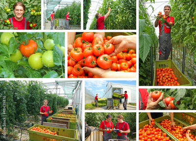 Picking tomatoes in a greenhouse, teamwork