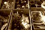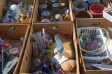 Cardboard boxes with old used household items and tableware on a garage sale or flea market at a sunny weekend, selected focus