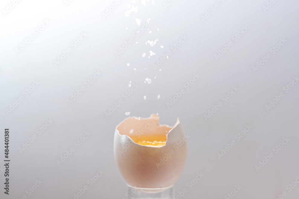 Cracked egg with yellow yolk is sprinkled with falling salt crystals, light gray background with copy space, motion blur, selected focus
