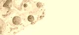 Macro Gold bubble drops in oil. Abstract flow color blots horizontal background.