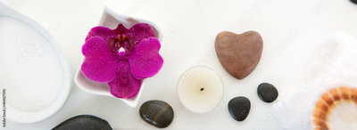 Spa setting with pink orchid, black stones and bath salts on wood background.