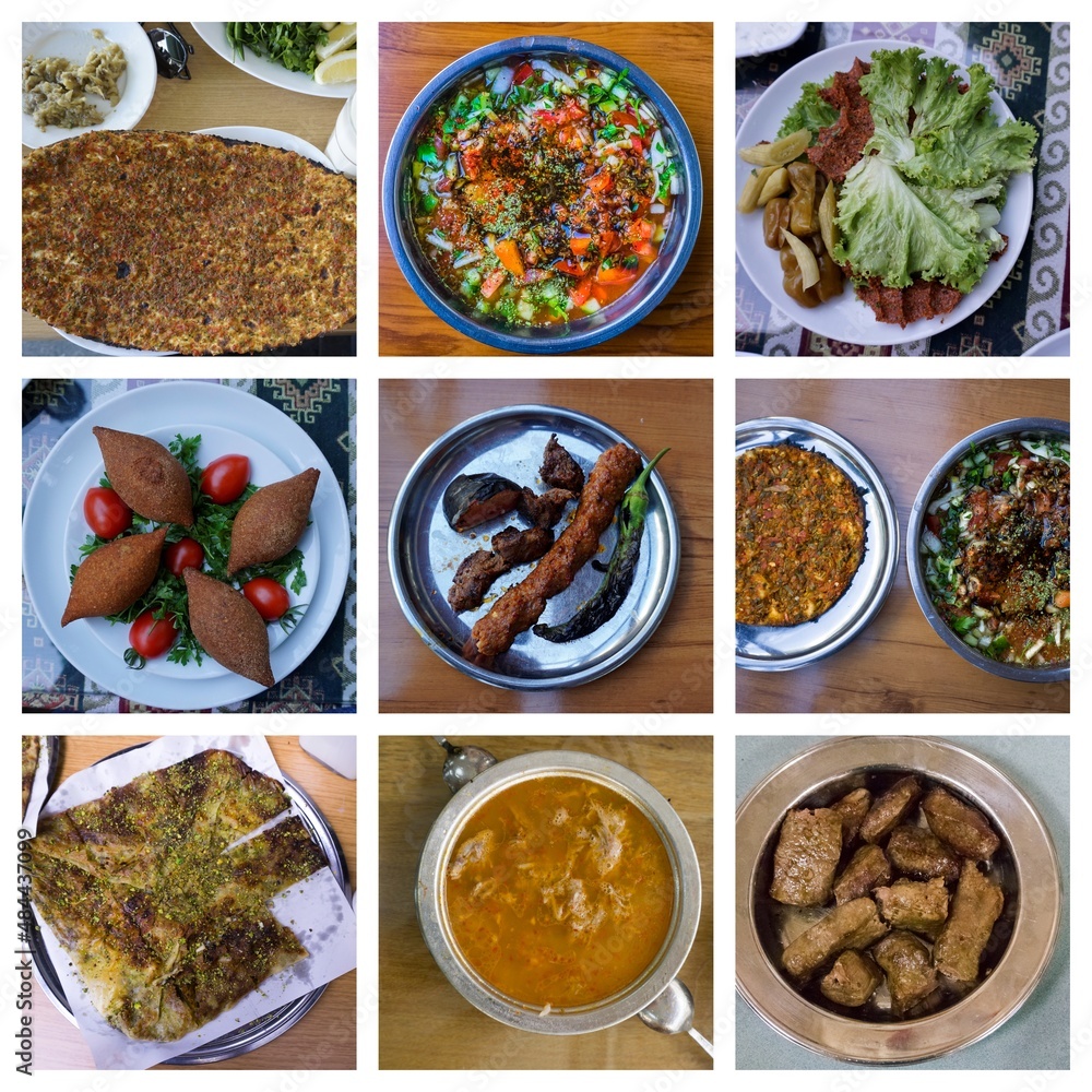 Traditional Turkish foods collage. Turkish cuisine. The popular foods of Gaziantep, Turkey. Ottoman cuisine. Lahmacun, Salad, Beyran Soup, Kusleme, Katmer, Icli Kofte, Cig Kofte and Sis (Susam) Kebab.