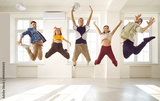 Happy contemporary dance crew jumping up in the air. Group of cheerful agile energetic young people having fun in a bright dance hall room. Excited dancer competition winners celebrating their victory