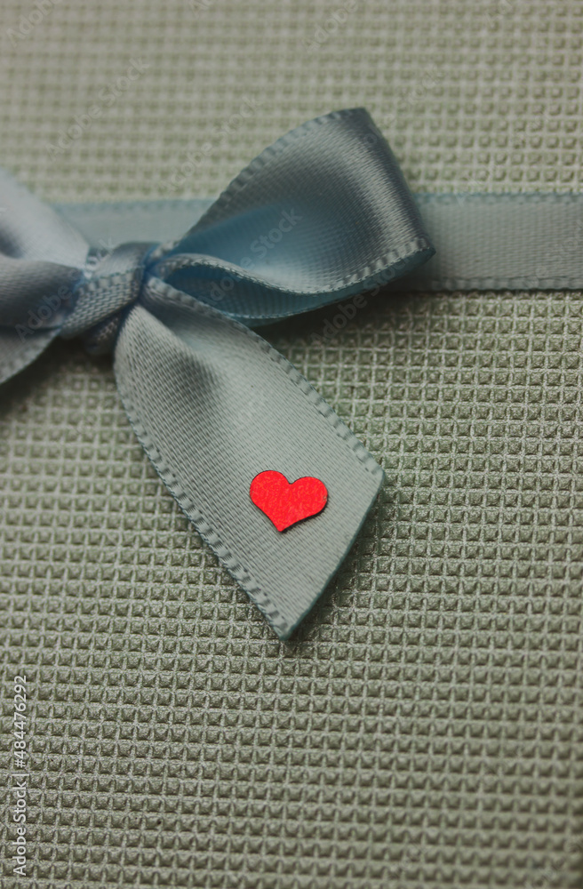 Blue silver gift box with bow and little red heart flatly. Gift given with love to boyfriend, girlfriend, husband, wife, mom, sweetheart lovers at Valentine's Day at February 14. I love you. Feelings.